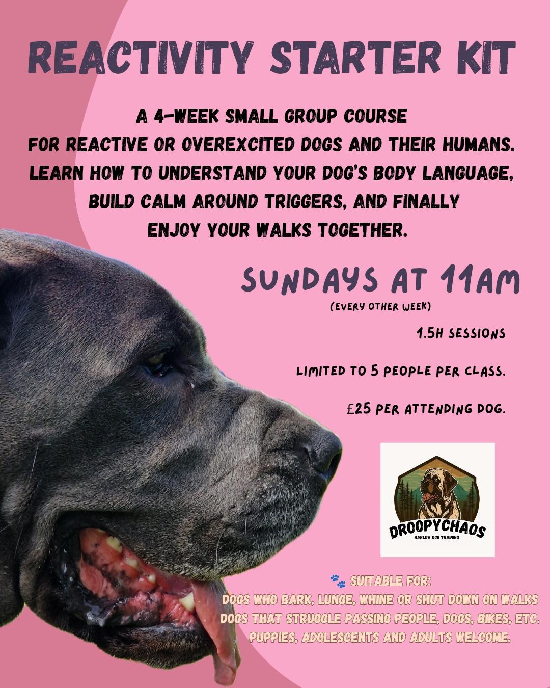 The Reactivity Starter Kit is a structured, supportive class designed for dogs who struggle with reactivity, over-arousal, or emotional overwhelm around other dogs, people, or environmental triggers.